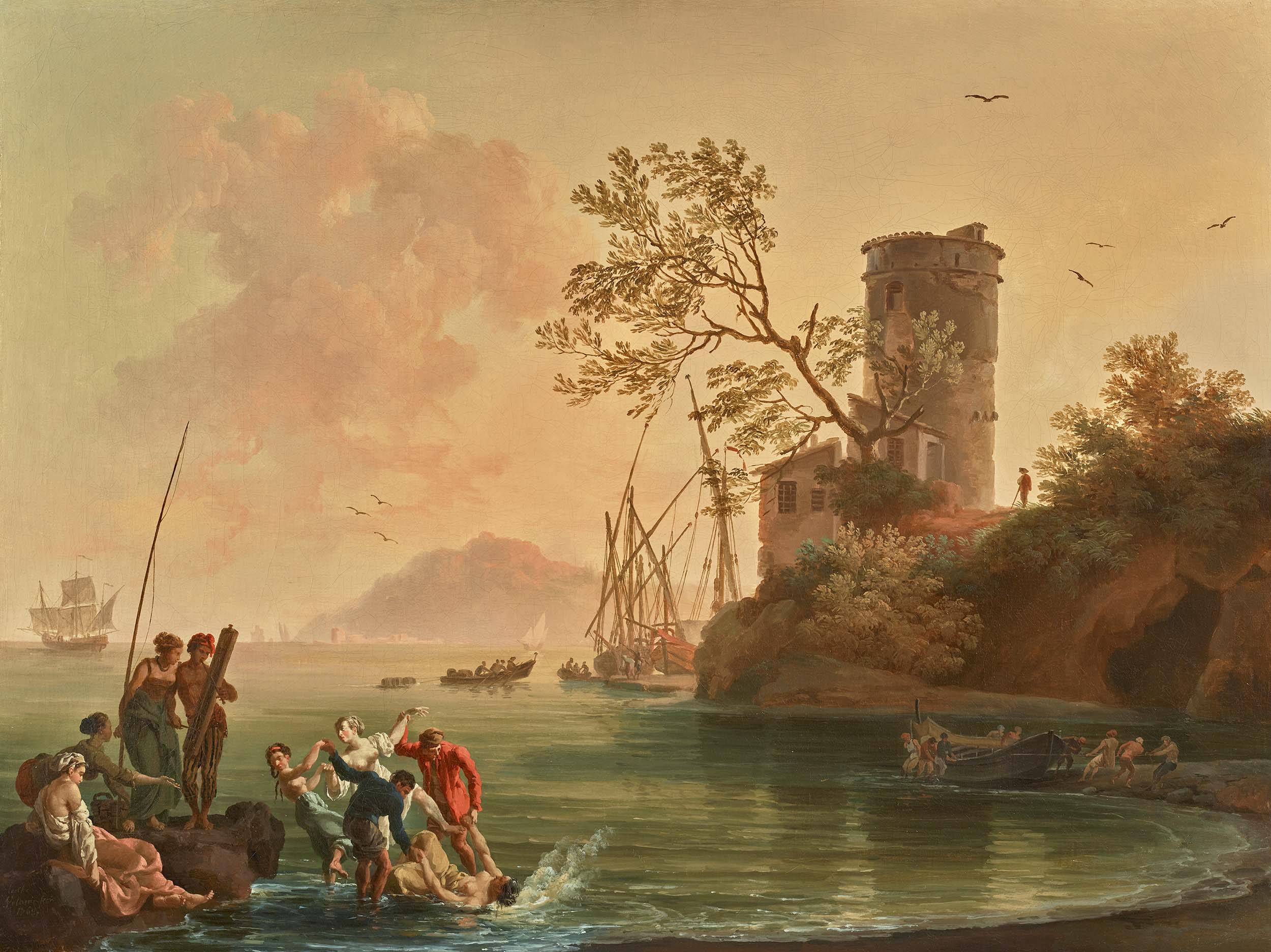 Nos deux tableaux, Bord de mer avec des pêcheurs et Marine avec des baigneurs, sont signés et datés de 1767 et 1768, soit une période qui correspond à la fin de sa période romaine. Ayant particulièrement bien réussi financièrement, ce qui lui permettait de vivre noblement, Volaire ajoute alors à son nom le titre de Chevalier que l’on retrouve ici dans les signatures. Ils peuvent être rapprochés d’une série des Quatre heures du jour commandée vers 1766 par le prince d’Anhalt-Dessau et conservée au château de Wörlitz. En particulier, on retrouve la même composition et les mêmes baigneurs dans notre Marine et dans la Marine avec des baigneurs de Wörlitz[1]. Il est donc possible que notre paire de peintures aient fait partie à l’origine d’une suite comparable de quatre paysages ; dans ce cas, il s’agirait de la représentation du Matin et de L’Après-midi. On peut alors tenter de rapprocher nos deux toiles de celles qui composaient la série des Quatre heures du jour peinte pour Louis-César-Renaud, duc de Choiseul-Praslin (1712-1785), passées aux enchères avec sa collection, à Paris, en 1793, les dimensions correspondent à celles de nos tableaux et qui étaient ainsi décrites dans le catalogue de vente : « Volaire. Disciple de Vernet. N°178 Quatre tableaux de même forme & mesure représentant les quatre heures du jour sous différents sujets de marine & de paysage avec diverses figures analogues & avantageusement distribuées. Ces morceaux, peints avec hardiesse et précision, offrent des productions intéressantes de cet élève distingué du célèbre Vernet. Haut. 20 p. larg. 26. T. » Ce lot a été acquis par le marchand Jean-Baptiste Pierre Le Brun (1748-1813) pour la somme de 1180 francs.