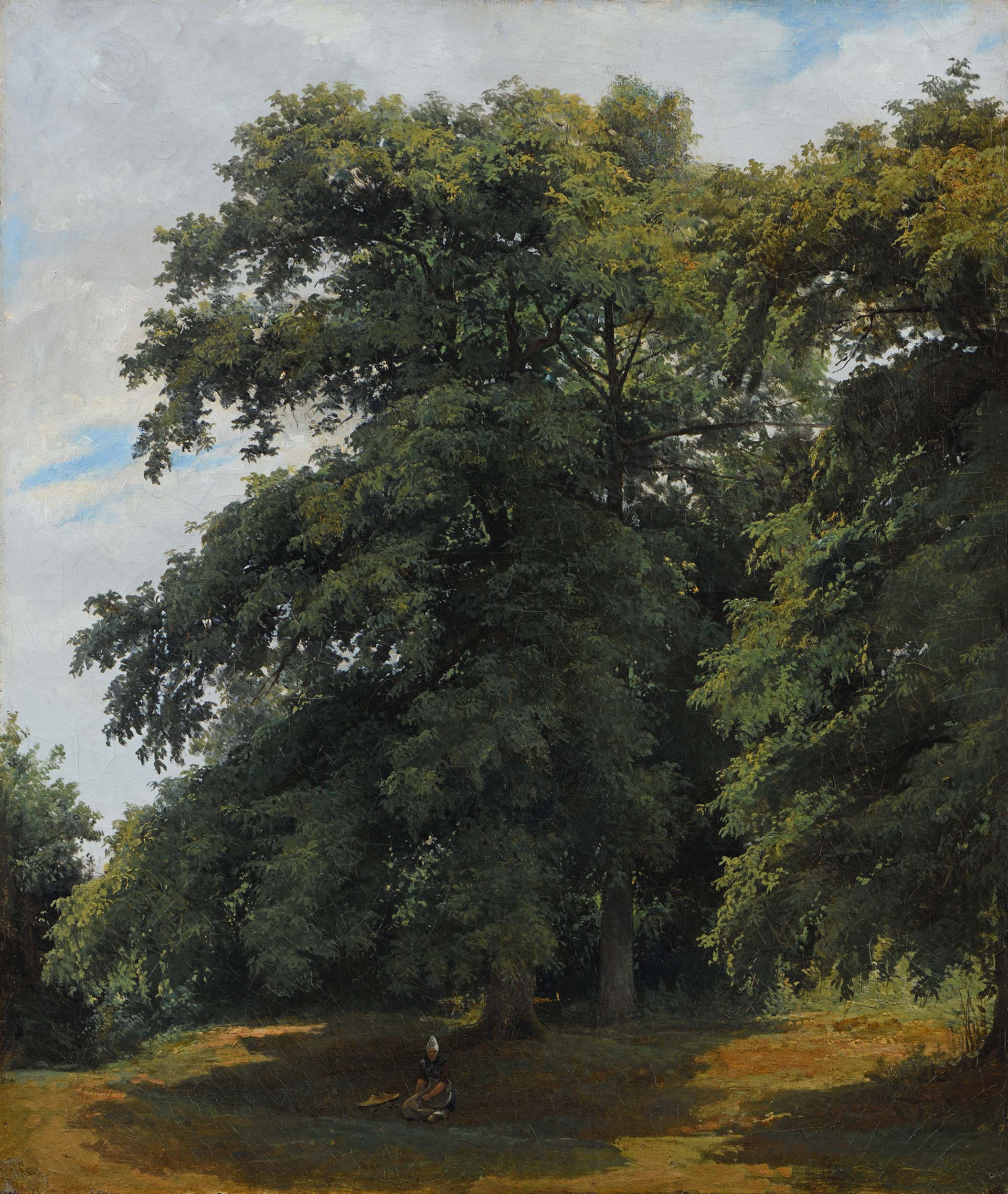 C’est un beau jour d’été que Leprince a choisi pour peindre ce coin de campagne. Avec un naturel confondant, il traduit la vigueur de la végétation et capte la lumière papillotante du soleil. On retrouve ici l’incontestable virtuosité technique, la simplicité de l’agencement, l’attention portée aux effets de lumière et l’éclat des coloris qui font tout le charme des œuvres de Leopold Leprince. Dans la partie inférieure gauche, une silhouette assise rappelle la présence humaine dans cette nature féérique, tout en soulignant par sa petitesse la grandeur des arbres. Notre toile peut être rapprochée d’une œuvre conservée au musée du Louvre, Au Bas-Bréau à Chailly (Fontainebleau), située et datée au verso comme notre Châtaignier. Devant cette fraîche étude d’arbre, on pense à ces mots de Constable : « Mon art limité et particulier se trouve au pied de chaque haie et dans chaque chemin de campagne, là où, par conséquent, personne ne pense qu’il vaut la peine de l’aller ramasser »[1]. Au moment à Leprince peint ce Châtaignier, il vient de participer à ce fameux Salon de 1824 où l’exposition des tableaux de Constable a fait tant de bruit dans les milieux artistiques parisiens. Leprince n’a pu rester insensible à cette leçon dont on trouve ici, sur un mode mineur mais avec une sincérité évidente, l’écho.