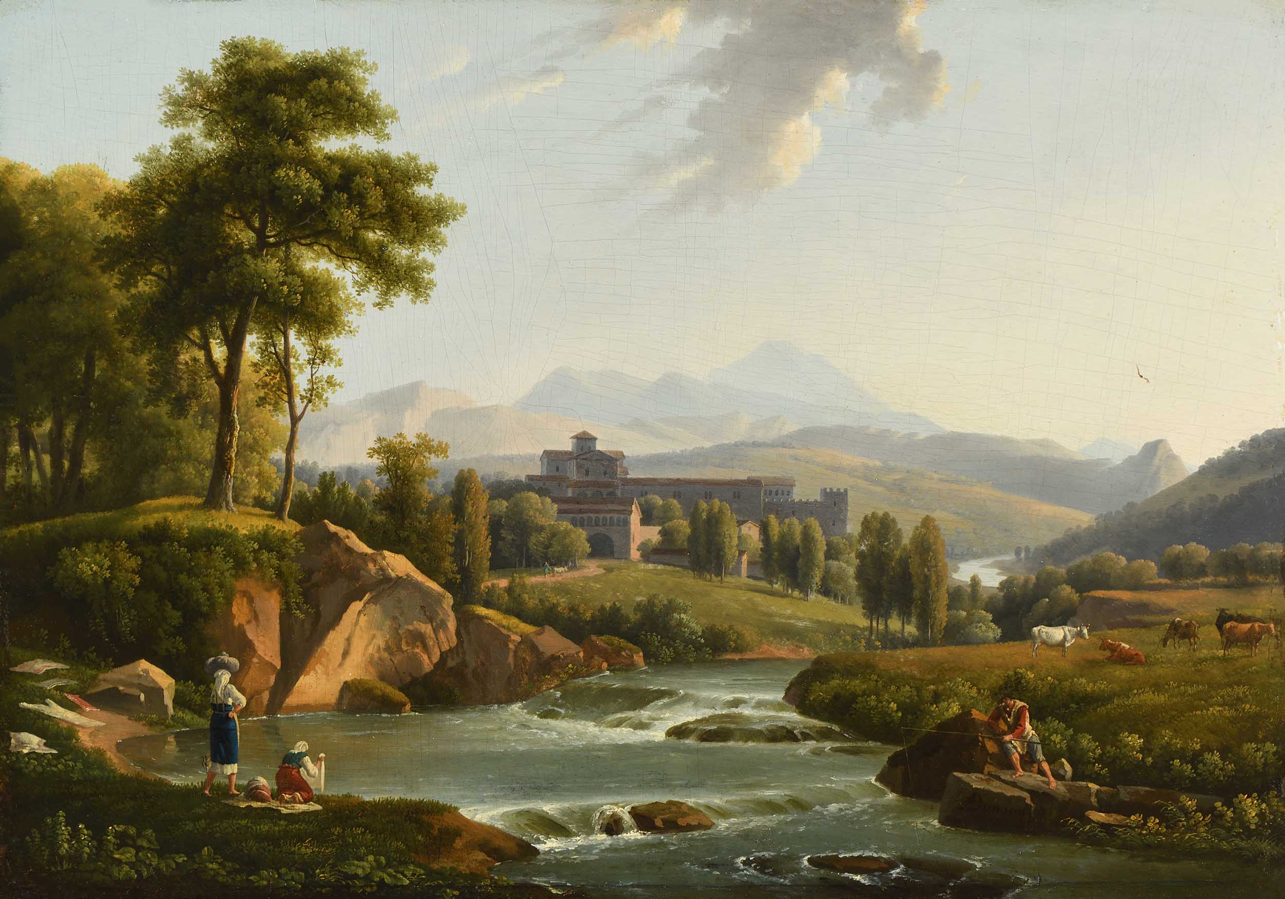 Contrairement à nombre de ses confrères, tels Bertin ou Bidauld, Dunouy a toujours marqué une nette préférence pour ce que Valenciennes qualifie de « paysage-portrait », la représentation d’un site précis : c’est précisément le cas de notre Vue de l’abbaye de Casamari. Ce monastère, autrefois connu sous le nom d’abbaye de Casa-Maria, abritait des moines trappistes, et était renommé pour être le refuge habituel des malfaiteurs et brigands des contrées romaines et napolitaines ; il fut fermé par les troupes napoléoniennes en 1811. Contrairement à ce que l’on peut parfois lire, le lieu ne tire pas son nom de la Vierge Marie, mais du fait qu’il se trouve à l’endroit où le consul romain Marius naquit. Il se situe près de Véroli (aujourd’hui province de Frosinone), dans la plaine, et non loin d’Isola di Sora. Toute cette région a été particulièrement parcourue par Dunouy lors de son premier voyage en Italie, entre 1786 et 1791. De ce voyage, l’artiste revient avec des carnets de dessins et d’esquisse qu’il utilise pour réaliser en France des œuvres achevées : un dessin représentant l’abbaye de Casamari est ainsi exposé au Salon de 1795 (collection particulière), avant que Dunouy ne propose, l’année suivante, sa version peinte. Il faut noter que dans cette dernière, l’artiste ne reprend pas le pont sur la rivière Cosa, un affluent du Sacco. Ici, Dunouy préfère magnifier les cascatelles de la rivière, animant son premier plan d’un bouvier en train de pêcher et de deux lavandières. A l’occasion de sa présentation au salon de 1796, notre tableau, qui a conservé son cadre d’origine, était accompagné d’un pendant, une Vue d’un torrent entre Rome et Naples, aujourd’hui non localisé.