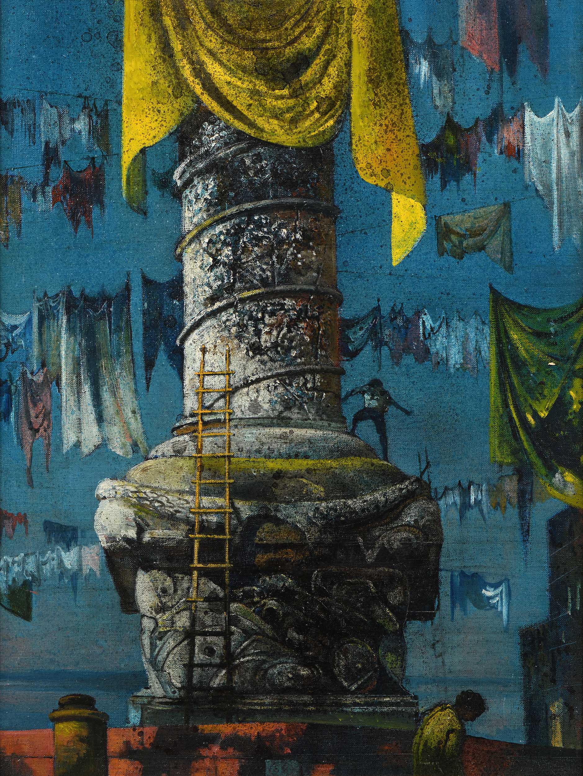 Une source d’inspiration constante dans l’art de Berman est l’Italie, visitée lors d’innombrables séjours depuis son premier voyage en 1922. Ses paysages métaphysiques recréent des ruines antiques, l’architecture palladienne et baroque, les plaines dépeuplées de la campagne romaine, les collines autrefois habitées par les Étrusques, la terre rude et ensoleillée de la Sicile. Entre 1955 et 1960, Berman réalise une série d’œuvres consacrées aux colonnes triomphales romaines - la colonne de Trajan et celle de Marc-Aurèle - motif que l’on retrouve dans des œuvres telles que la Vue imaginaire de Rome de 1954 (collection particulière)[1] ou la Colonne de Trajan de nuit, datée de 1960 (collection particulière)[2]. Notre Colonna crepuscolare montre une scène poétique juxtaposant colonne triomphale et linge étendu, la grandeur antique et la vie prosaïque de tous les jours. L’atmosphère est sombre et surréaliste, dominée par des tons bleus, rouges et jaunes. Bien que le titre suggère que le sujet principal devrait être le monument pris dans son intégralité, la colonne n’est ici que partiellement visible : on n’en perçoit que le socle monumental et le bas-relief en spirale qui en entoure le fût. La base, ornée de reliefs en marbre figurant boucliers, casques et cuirasses, n’est pas réaliste et paraît même un peu légère pour supporter le poids de la colonne. Le contraste entre la petitesse des personnages et les dimensions du monument produit un effet visuel et symbolique de grande puissance. La couleur volontairement artificielle du ciel contribue à transporter le spectateur dans une dimension suspendue, au-delà de l’espace et du temps, donnant à l’image l’apparence d’une vision intemporelle. Notre Colonna crepuscolare condense la poétique la plus authentique de Berman : dans cette rencontre entre la gloire ancienne et la fragilité humaine, entre la solidité de la pierre et la légèreté du linge, l’artiste suscite des émotions contrastées, mêlant mélancolie et émerveillement dans une scène qui transcende le réel pour devenir une réflexion universelle sur le rapport de l’homme au temps.