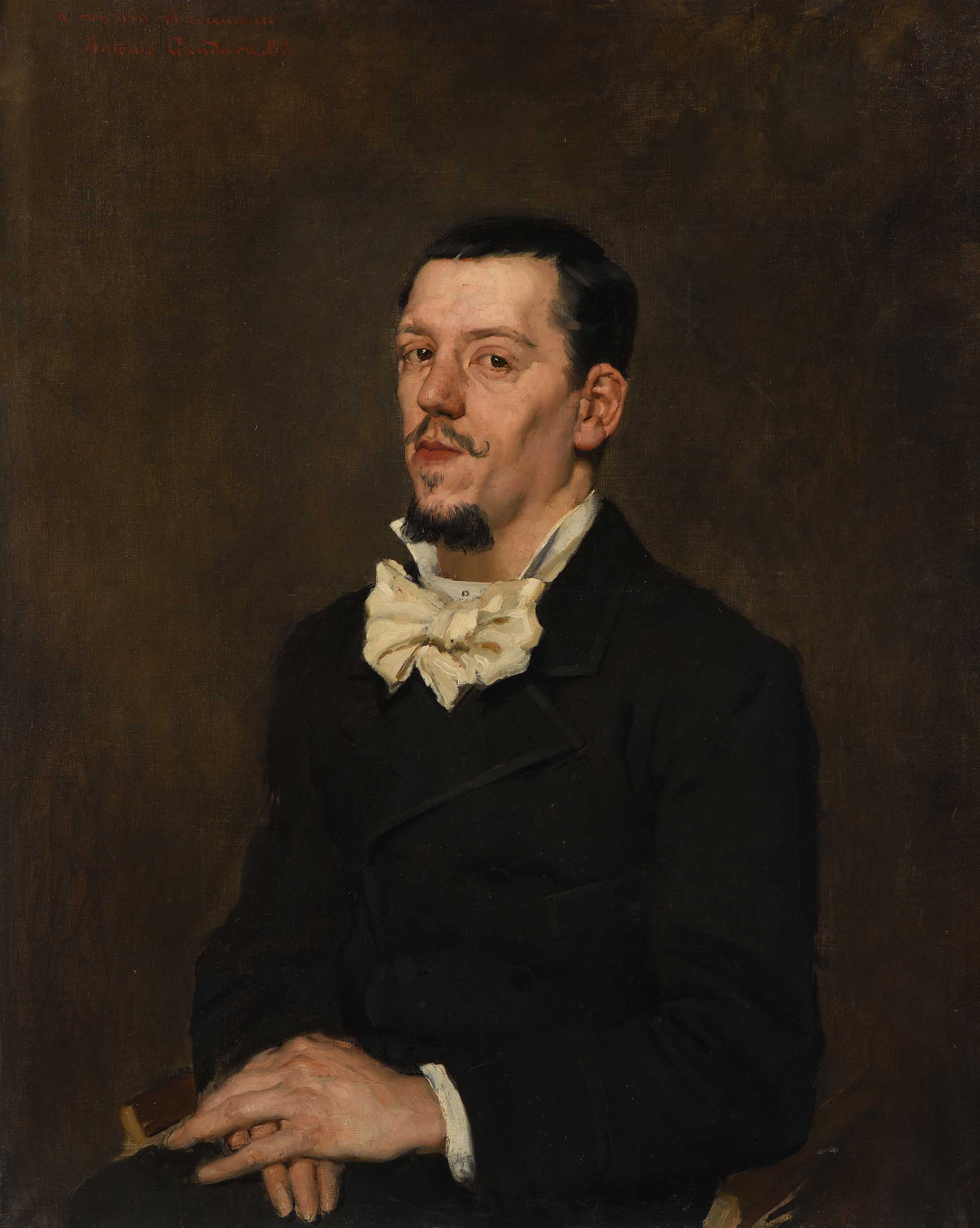 L’année suivante, La Gandara peint notre portrait, probablement en remerciement de la dédicace. À ce moment-là, l’artiste est au début de sa carrière : après une formation dans l’atelier de Jean-Léon Gérôme, il réalise ses premières œuvres - portraits de famille, scènes de genre et natures mortes. C’est l’époque des portraits sombres, empreints d’un fort caractère, marqués par le souvenir de Ribot et de la peinture espagnole du XVIIᵉ siècle (Portrait de M. Baroy, collection particulière). Il est très probable que La Gandara ait eu accès aux œuvres de Manet, dont l’influence, notamment dans l’usage du noir et l’économie de moyens, est frappante. Notre portrait est typique de cette veine : le poète est représenté sobrement, assis, les mains croisées sur les genoux ; le fond est sombre, dépourvu de décor, et le vêtement uniformément noir, seulement égayé par le col cassé et la cravate blanche. L’attention se porte sur la tête, nerveuse et fine, - admirez la construction solide du front sous les cheveux courts, la légère ligne d’ombre qui fait saillir la tempe, la vive expression des yeux, le dessin du nez et de la bouche sous les moustaches redressées - ainsi que sur la vérité de la carnation et la facture, tout à la fois parfaite et non minutieuse, du bouc brun, légèrement ondulé. L’œuvre est signée « Antonio Gandara » : l’artiste n’ajoutera la particule « de » qu’à partir de 1885[2].