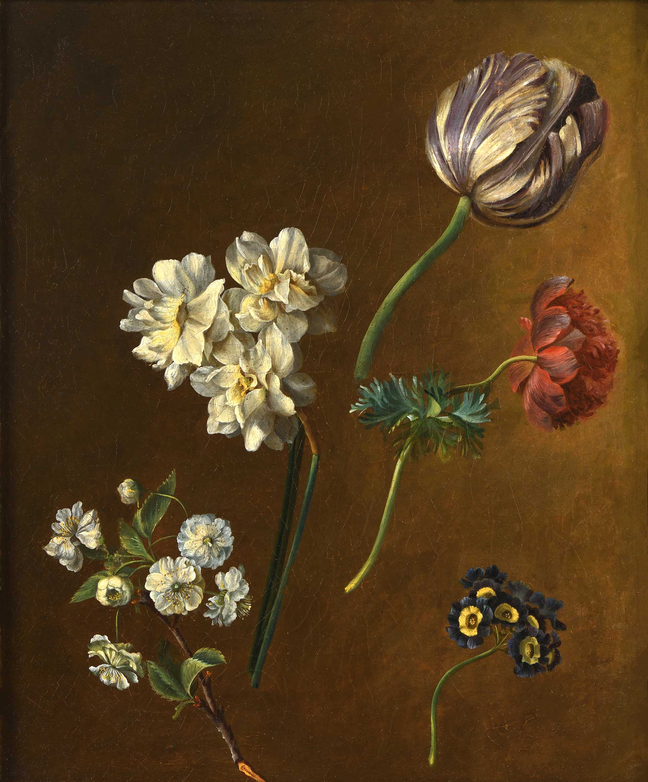 Outre les importants tableaux représentant des bouquets de fleurs qui ont fait sa réputation, Christiaan van Pol exécute de nombreuses miniatures ainsi que des études florales d’une finesse et d’une précision qui témoignent de l’habileté de l’artiste. Ces œuvres sont presque toujours peintes sur un fond sombre, s’éclaircissant sur la partie droite. Elles ne semblent pas préparatoires à des bouquets et sont plutôt à considérer comme des œuvres achevées, sortes de documents à caractère botanique. On peut rapprocher notre tableau de deux études, Branche de lilas et Une tige de roses panachées, conservées au musée Calvet à Avignon[1], ainsi que d’autres pièces conservées en collections particulières[2]. Dans notre œuvre, van Pol s’attache à représenter, de gauche à droite, un prunus, un narcisse, une tulipe, une renoncule et une primevère. Dans cette composition particulièrement épurée, van Pol réussit à équilibrer les divers éléments avec une rigueur parfaite tout en évitant toute sécheresse. La palette restreinte, la sobriété de l’exécution et le rendu délicat des matières confèrent à notre tableau une poésie singulière. Comme souvent chez l’artiste, les fleurs sont en train d’éclore : cela permet d’apporter du volume à une composition très sobre qui se réduit à un fond sombre sur lequel chaque fleur se détache individuellement, sans rompre l’harmonie de l’ensemble. Cette étude florale, d’une très grande qualité d’exécution, illustre le goût de l’époque pour le raffinement et la poésie tirée de la nature, en accord subtil avec une exigence scientifique.