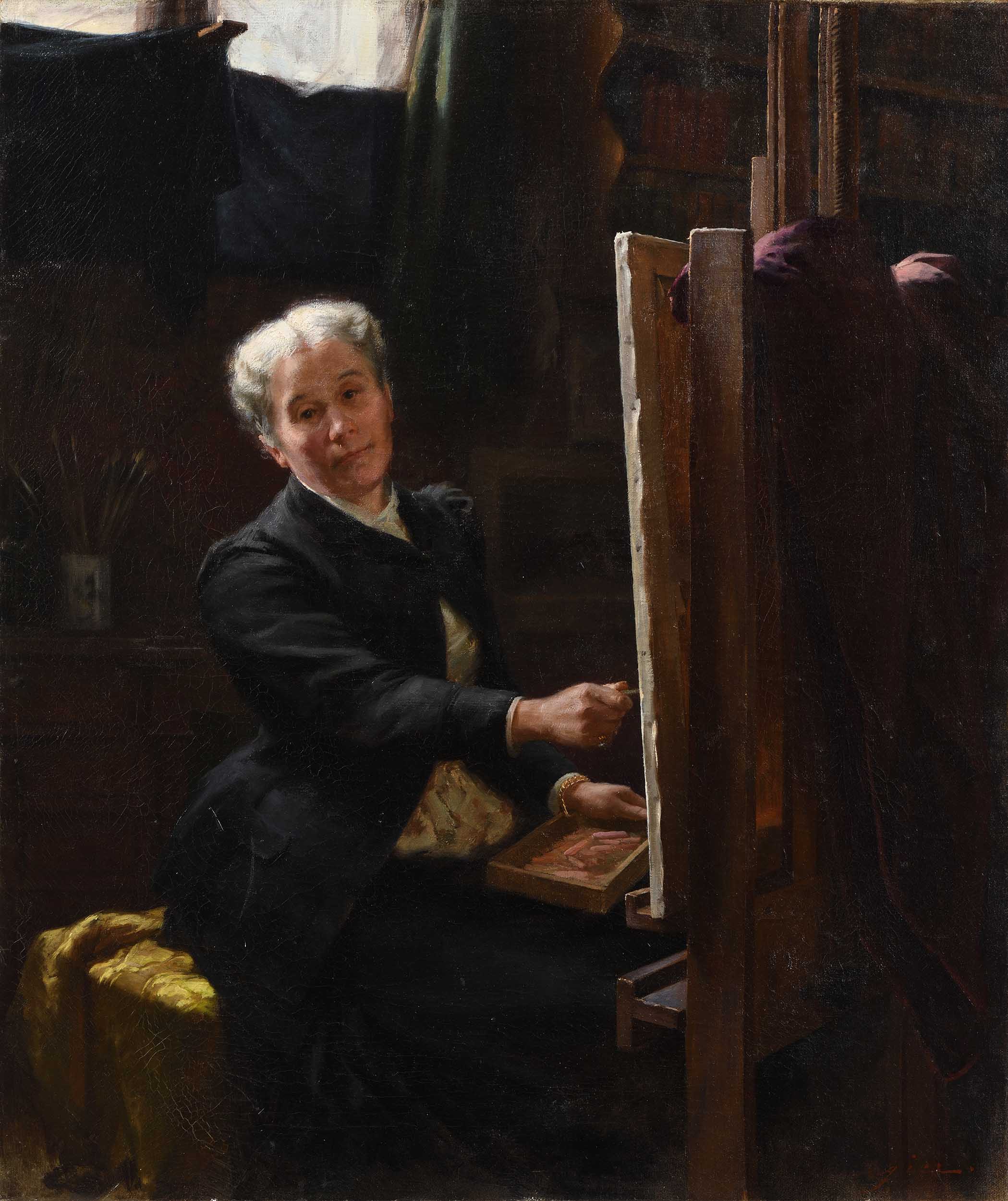 S’illustrant d’abord dans les scènes de genre historiques en peinture, Jeanne Rongier s’essaye, à partir des années 1880, au pastel. Ainsi, en 1889, elle en expose certains à l’Union des femmes peintres et sculpteurs, première société de femmes artistes en France, fondée par la sculptrice Hélène Bertaux (1825-1909) en 1881. Ses talents de pastelliste, notamment dans l’art du portrait, sont rapidement loués. Ainsi, un critique écrit en 1895 que « Mlle Rongier a voulu elle aussi aborder ce genre nouveau qui convenait bien à la nature de son talent. Elle en a tiré des effets d’une délicatesse et d’un charme infinis. Sous sa main habile la poudre impalpable a pris des tons d’une fraîcheur et d’un velouté auxquels atteint difficilement la peinture à l’huile[1] ». C’est dans cette activité de pastelliste que Mme Rongier décide de se représenter, âgée d’une cinquantaine d’années, autour de 1900. Dans son atelier, elle est assise devant un chevalet, son bras gauche tenant une boîte de pastels tandis que de sa main droite, elle applique un des bâtonnets sur la surface de la toile. Se tournant légèrement vers le spectateur, elle fixe ce dernier d’un regard pensif empreint de douceur. Dans cet Autoportrait, Jeanne Rongier se représente avec précision et sensibilité, cherchant à faire passer à la postérité son statut de femme artiste.