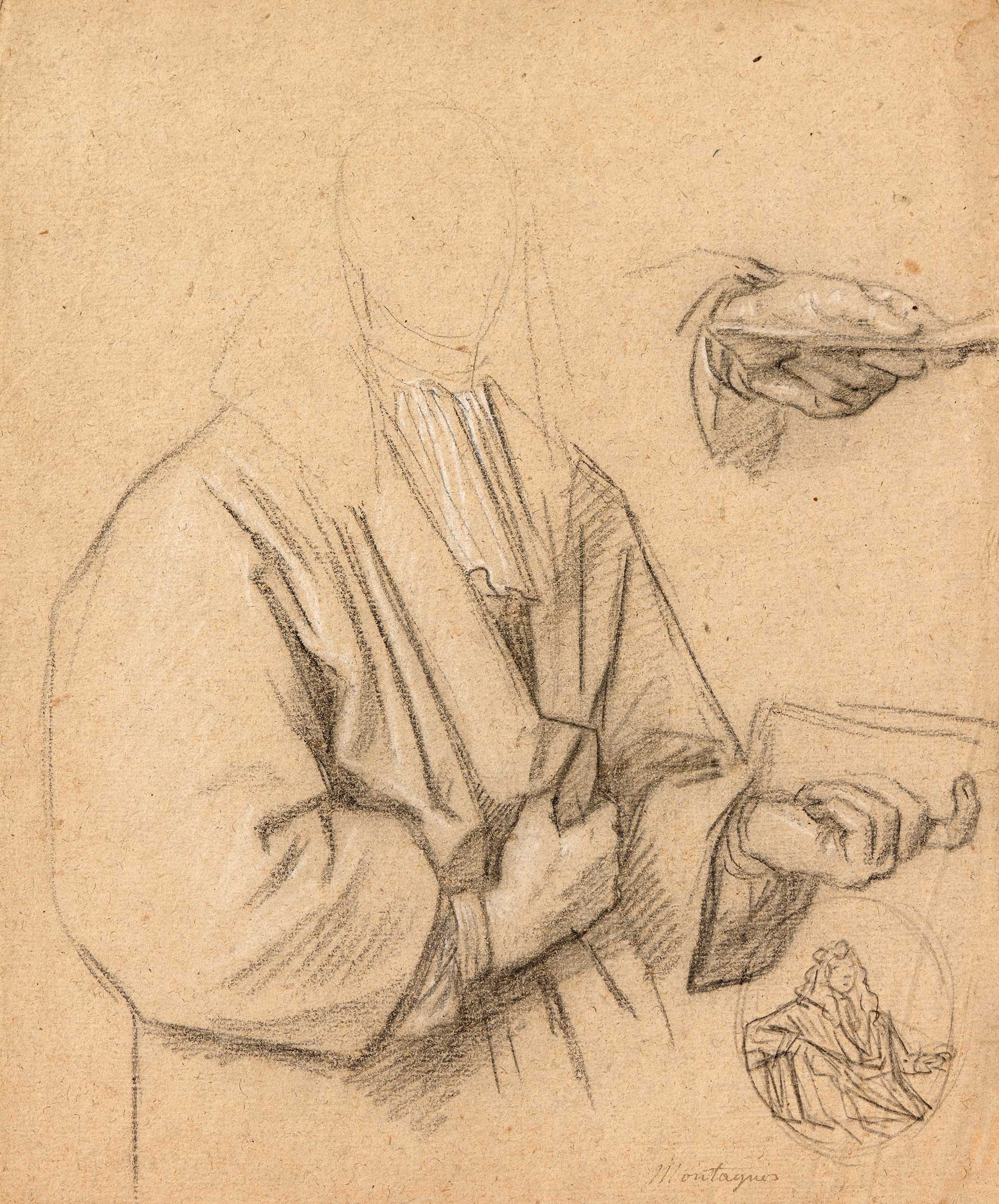 La force et la vigueur du trait sont tout à fait remarquables dans cette étude et le schématisme est très poussé, notamment dans le visage, à peine esquissé. La composition jouant sur les ruptures et sur l’angularité, les mains puissantes apparaissent comme autant de caractéristiques du style énergique et concis de Plattemontagne, tout comme la mise en place succincte de la tête. L’inscription manuscrite « montagne » portée au bas de cette feuille est similaire à celle que l’on trouve sur des dessins dispersés dans plusieurs cabinets d’arts graphiques, notamment au musée des Beaux-Arts de Rouen[2]. Grâce au témoignage de Pierre-Jean Mariette, nous savons maintenant que cette annotation renvoie aux œuvres de Plattemontagne : comme le nom de Plattenberg, francisé en Plattemontagne, paraissait encore trop long à prononcer, l’artiste « consentit qu’on l’appelât tout simplement Montagne[3] ». Cette annotation, qui n’est pas une signature, a probablement été portée sur les dessins de l'artiste lors de l’inventaire après décès de son atelier, en 1707.