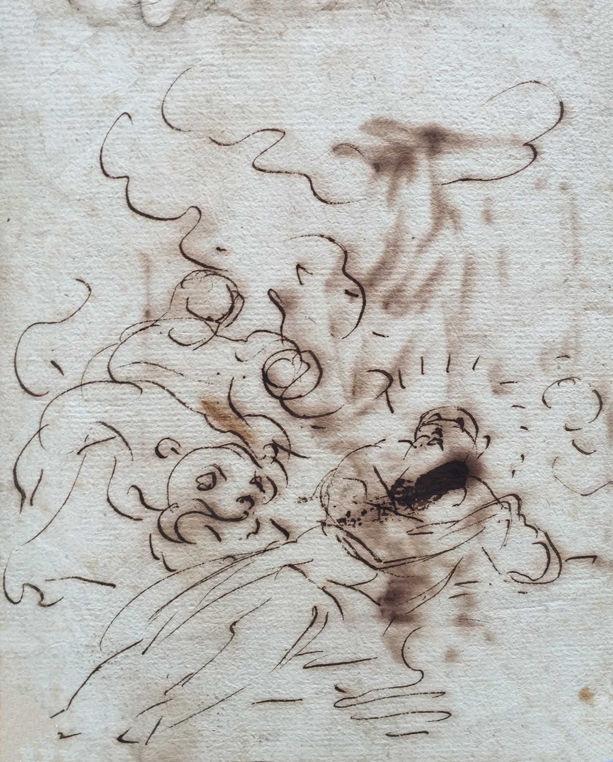 L’artiste s’est fréquemment livré à l’exercice du portrait, qui le conduit à la caricature. Beaucoup de celles-ci représentent des membres du clergé, tandis d’autres chargent le monde de l’art et les amis de l’artiste, Rosa, Testa ou Simonelli, certaines enfin sont autobiographiques[1]. Même si l’inscription portée en anglais sur le bas du dessin est ancienne, elle est cependant à prendre avec précaution, les portraits de l’artiste étant très rares. Le dessin exécuté au verso de notre feuille, une esquisse de composition pour un Daniel dans la fosse aux lions, n’a pu être mis en relation avec aucune œuvre connue de l’artiste.