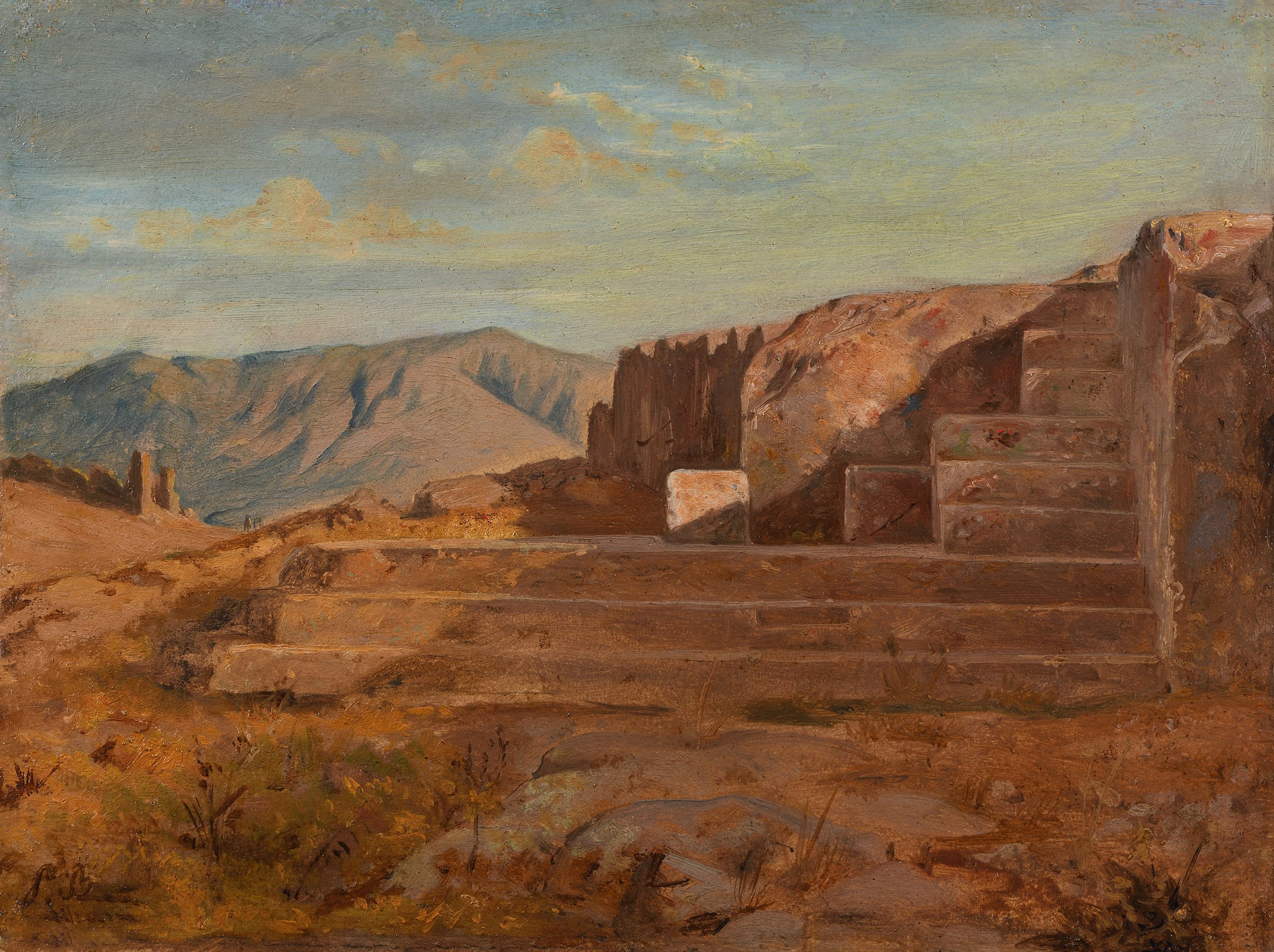 En 1842, Bonirote réalise son premier tableau à sujet grec, La Romaïka, danse grecque, à la tribune aux harangues, à Athènes (Nicosie, fondation de lâarchevêque Makários III, fig. 1), exposé avec succès au Salon de Lyon la même année : cinq jeunes femmes exécutent les figures de la romaïka, danse folklorique grecque, au son dâun fifre et dâun tambour. Plusieurs voyageurs évoquent cette danse et sa musique, comme Léon Belly qui confie à sa mère, dans une lettre envoyée de Constantinople le 24 novembre 1850, que lâair de la romaïka est « assez amusant, bien quâil blesse le tympan dâun bout à lâautre[2] ». Autour des danseuses, des bergers ; au second plan se dresse lâAcropole, tandis que sur la droite sâélève le mont Hymette. La Romaïka a été soigneusement préparée ; on connaissait jusquâà présent une étude pour lâAcropole, conservée au musée Ingres à Montauban. Notre huile sur papier constitue une seconde étude, centrée sur le mont Hymette et la tribune des orateurs. Cette dernière, dont il ne reste que les marches dâaccès, se situe sur les flancs de la colline de la Pnyx (« lâendroit où lâon se tient serré »). Elle permettait aux tribuns de sâadresser à lâEcclésia, assemblée des citoyens, qui votait les lois et le budget de la ville, élisait les magistrats ou désignait les membres de la Boulé (Conseil). Ce lieu chargé dâhistoire a fasciné les artistes européens comme Théodore Caruelle dâAligny ou Ãdouard Bertin qui découvrent la Grèce dans les années 1840[3]. Bonirote accorde une attention particulière à la description des rochers et du terrain, en adoptant un cadrage inattendu centré sur lâemmarchement de pierre. Le coloris dâune grande sobriété, privilégiant les tons de terre et dâocres, la lumière forte coupant la composition en deux parties, tout concourt à déterminer une atmosphère sereine et minérale. Lâimpression de grandeur et de majesté qui se dégage de lâensemble permet dâévoquer un des plus célèbres sites grecs mais aussi lâAthènes démocratique de Périclès.