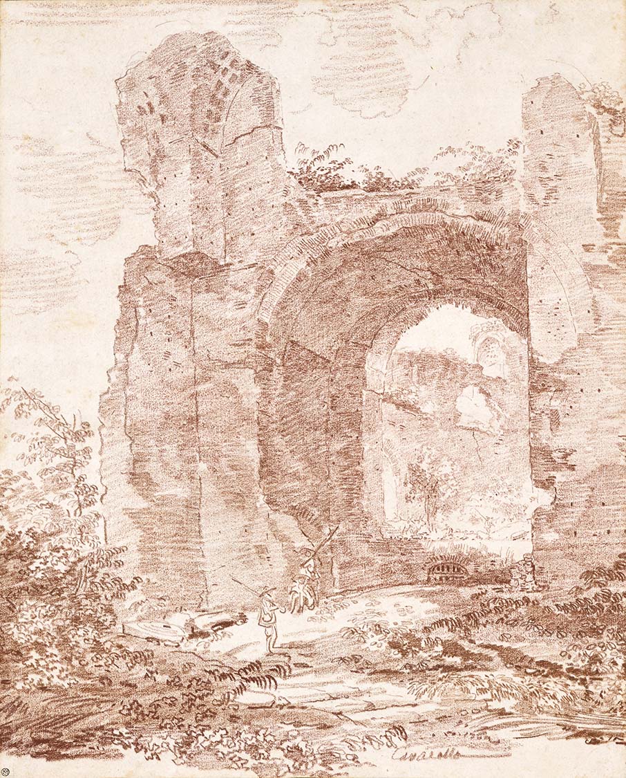 Notre feuille, datée 1762, s’inscrit tout à fait dans cet ensemble. A cette époque, Robert, ayant acquis une grande dextérité durant son séjour à l’Académie de France, exécute ses sanguines sur le motif, avec une grande rapidité. Ici, il s’est placé dans les ruines des thermes de Caracalla, un endroit qu’il a curieusement peu représenté. Il s’est probablement placé dans le hall central et réalise une vue proche de celle représentée par Giovanni Battista Piranesi dans sa planche des Vues de Rome, Les Bains de Caracalla : intérieur du hall central (Hind 77). L’artiste se montre nerveux et précis dans le tracé des lignes des architectures. Il joue avec le grain du papier pour créer les ombres du premier plan qui s’opposent aux parties laissées en réserve, cela afin de suggérer la projection de la lumière méridionale sur les façades des ruines. Robert dessine ensuite les silhouettes des deux bergers du premier plan, dont la petite taille accroît l’échelle des lieux. La franchise de l’angle de vue frontal alliée à l’écriture nerveuse de la feuille est tout à fait caractéristique de la production des sanguines exécutées vers 1762-1763.