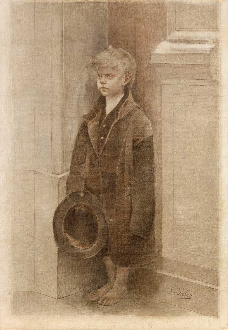 Notre tableau constitue une esquisse inédite pour le tableau de grand format très récemment acquis par le musée d’Orsay (huile sur toile, 156 x 79 cm, fig. 1)[2]. Dans ce tableau, présenté pour la première fois au Salon de 1886 avec un titre allégorique des plus programmatiques, Misère, Pelez montre un gamin des rues, pieds nus et sales, vêtu d’habits rapiécés, la tête blonde soulignant par contraste le paletot de grande personne et la misère de son état. Le garçon se tient droit comme au garde-à-vous, figé dans sa résignation, inexpressif, stoïque, le regard fixé devant, le chapeau bas prêt à être levé au passage d’un bourgeois pour demander l’aumône, rencogné dans une embrasure d’immeuble dont la porte est elle-même poussiéreuse – celle, semble-t-il, de l’immeuble de l’atelier de Pelez, situé au 62 boulevard de Clichy.