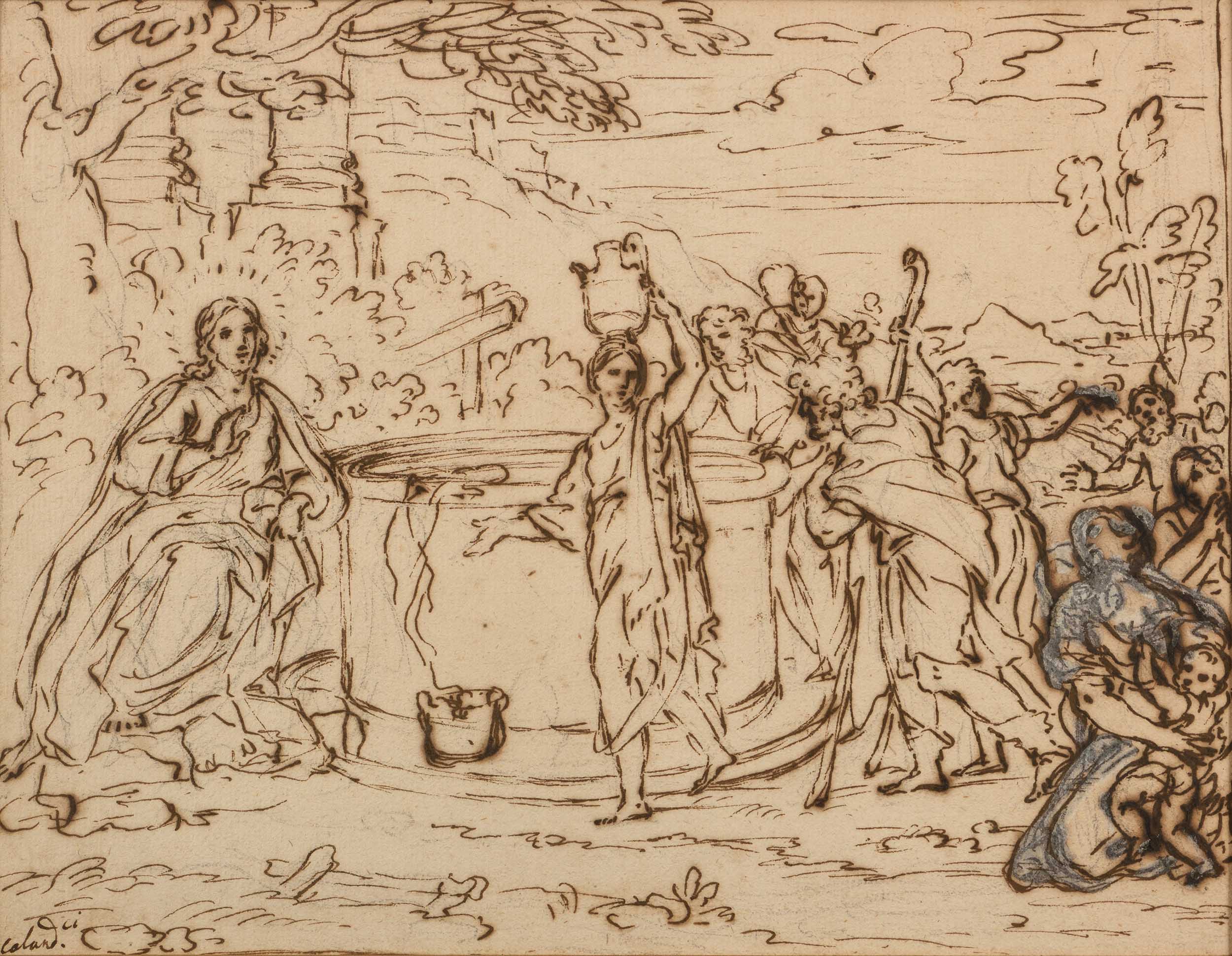 Nous ignorons si Calandrucci a réalisé une peinture ou une fresque sur le thème du Christ rencontrant la Samaritaine au puit mais nous savons qu’il a réfléchi à la composition car nous connaissons plusieurs dessins sur ce thème : quatre dessins sont conservés au Kunstpalast de Düsseldorf[1] tandis qu’un cinquième dessin est conservé en collection particulière[2]. Toutes ces œuvres sont en rapport avec une estampe anciennement attribuée à Carlo Maratta[3] mais aujourd’hui donnée à Francesco Giovane, probablement réalisée d’après une composition de Calandrucci. Notre composition est différente, plus ample et plus développée : le Christ, assis à gauche à côté du puit de Jacob, voit venir à lui la Samaritaine portant une cruche sur sa tête précédant une petite foule de pèlerins, femmes et enfants. Ici, l’artiste cherche probablement à évoquer, plutôt que la rencontre entre le Christ et la Samaritaine, les derniers versets du récit qui racontent que, convaincue par le message transmis par Jésus, la Samaritaine est allée chercher en ville ses voisins et amis pour les guider vers le Christ (Évangile de saint Jean, IV, 1-30). Notre composition se rapproche ainsi du tableau d’Annibale Carracci sur le même thème, réalisé vers 1595 et aujourd’hui conservé à la Pinacoteca di Brera à Milan. Première idée de composition exécute d’un trait de plume enlevé, notre feuille signée constitue un ajout important au corpus des œuvres graphiques de Calandrucci.