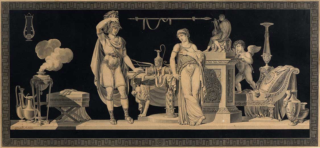 Notre paire de dessins illustrent deux scènes des amours de Pâris et Hélène. La première scène nous montre le moment de la rencontre entre Pâris, déguisé en berger, et Hélène, reine de Sparte. Dans la seconde, Pâris prend les armes pour aller défendre Troie en laissant son amante éplorée. Ces deux scènes, entourées de frises à motifs géométriques pris dans le vocabulaire à l’antique, sont animées d’un mobilier précisément décrit – lit de repos, candélabre, table, tabouret et cassolette à encens – qui accentuent la référence à l’Antiquité. On retrouve des éléments très semblables à ceux-ci dans une paire de dessins représentant Achille pleurant la mort de Patrocle et Achille jouant de la lyre, conservés à la bibliothèque Marmottan de Boulogne-Billancourt. Par ailleurs, il existe une autre version du Pâris s’armant pour aller combattre de plus petites dimensions (collection particulière). Il est probable que cette paire de dessins était destinée à être gravée mais ces estampes non pas été retrouvées jusqu’à présent.