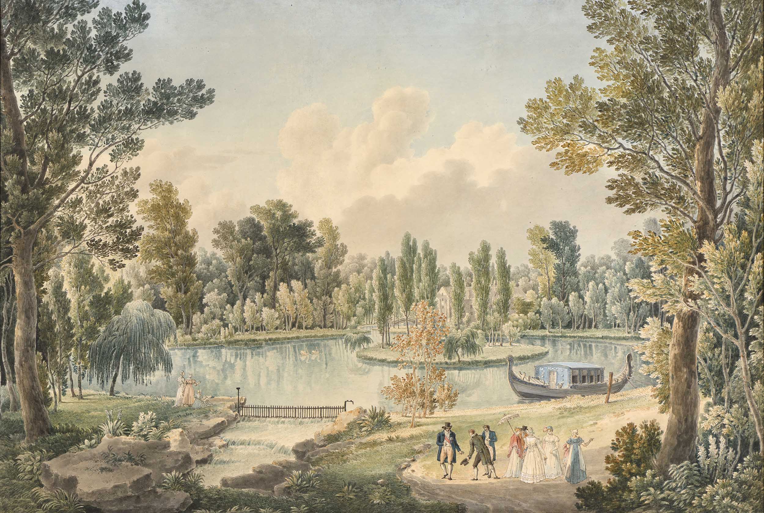 C’est précisément ce qu’a représenté ici Constant Bourgeois : Joseph, revêtu de l’habit à la française et portant le cordon de la légion d’Honneur fait les honneurs de son parc à un petit groupe d’ami. Un bateau semble attendre la compagnie pour faire le tour du lac de Vallière tandis que, sur la gauche, trois femmes dont une dessinatrice, admirent le paysage près d’un trop-plein qui conduit à l’étang des Islettes. Bourgeois connaissait particulièrement bien le domaine de Mortefontaine : probablement vers 1806-1807, Alexandre de Laborde lui commande une série de vues du domaine, destinées à être gravées pour l’illustration de sa Description des nouveaux jardins de la France et de ses anciens châteaux, publié en 1808. Dans cet ouvrage fameux pour l’histoire des jardins, Laborde consacrera pas moins de 15 planches à Mortefontaine, toutes dessinées par Bourgeois. Peut-être notre feuille était-elle destinée également à cette publication sans avoir jamais été gravée.