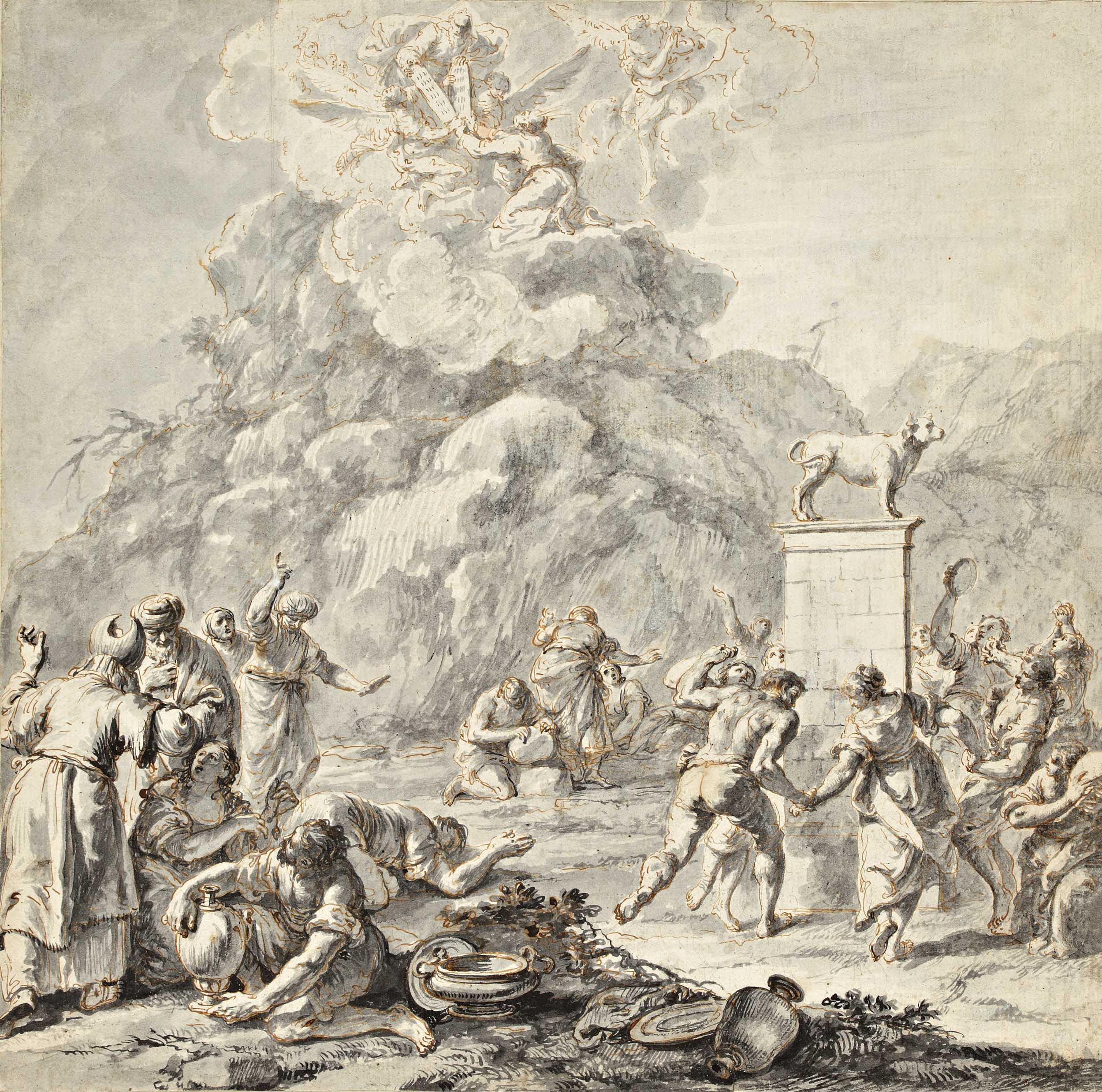 On connaît deux types de dessins de Fontebasso : les petites études à la plume et les dessins très achevés. Celui proposé ici fait partie de cette dernière catégorie et illustre un sujet rare, celui de l’adoration du veau d’or. Ce thème a également été traité par Fontebasso pour une toile réalisée en 1759 pour la décoration du salon principal du palais du Buonconsiglio, résidence de l’évêque de Trente, Felice Alberto d’Enno (et toujours conservé au Museo del Castello del Buonconsiglio à Trente). Sur le même sujet, sont également connus le bozzetto de ce tableau conservé dans une collection particulière et une autre version de ce sujet, avec des variantes, aujourd’hui à la Fondazione Luciano et Agnese Sorlini à Venise[1]. Les éléments de composition de ces trois tableaux et de notre dessin sont semblables : dans la partie supérieure, Moïse s’apprête à recevoir les Tables de la loi ou les montre au peuple des Hébreux, tandis que dans la partie inférieure, des Hébreux s’empressent autour du veau d’or et des prêtres s’apprêtent à faire un sacrifice. Sans être préparatoire à une peinture, notre feuille est plus proche de la version de la Fondazione Sorlini où l’on retrouve la même figure agenouillée en bas à gauche. Comme les Tiepolo, Fontebasso a réalisé des séries de dessins finis, essentiellement consacrées à l’histoire sacrée. Notre dessin pourrait avoir fait partie d’une de ces séries mais les dimensions de cette feuille sont cependant plus petites que celles des autres feuilles actuellement connues.