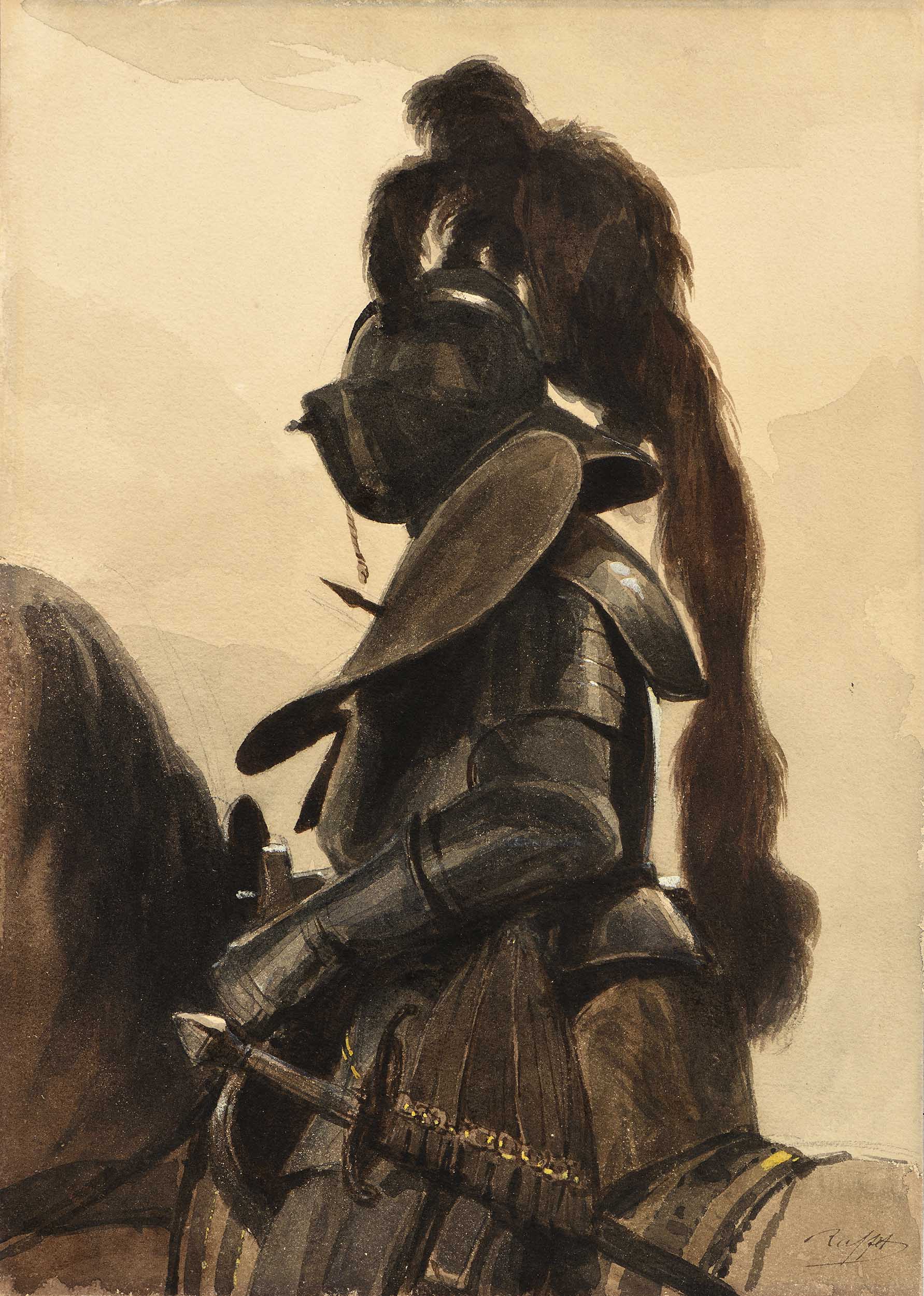La prompte renommée que Raffet acquiert dans le domaine de la lithographie et de l’illustration ne l’empêchera pas de continuer à manier la plume et le pinceau jusqu’à la fin de sa carrière. Toute sa vie, Raffet s’est intéressé aux armes et aux armures ainsi qu’aux costumes militaires de toutes les époques. Dès 1830, il fréquente de manière assidue le musée de l’Artillerie, ouverte en 1796 place Saint-Thomas-d’Aquin à Paris et ancêtre de l’actuel musée de l’Armée. Plusieurs dessins au crayon et à l’aquarelle réalisés à cette époque sont aujourd’hui conservés au musée du Louvre et à la Bibliothèque d’Art et d’Archéologie à Paris[1]. Nous savons également qu’en 1856, l’artiste passe un long moment à étudier les armures conservées dans la collection des Armes et Armures de la Hofburg à Vienne et au château d’Ambras, près d’Innsbruck[2]. Probablement réalisée à cette époque, notre aquarelle représente une armure du XVIe siècle, placée sur un cheval-mannequin. Raffet renforce l’effet réaliste en accentuant le long plumet descendant du casque mais surtout en dessinant à l’arrière fond un ciel et des nuages, sortant l’œuvre de son musée pour la mettre quasiment en situation sur un champ de bataille.