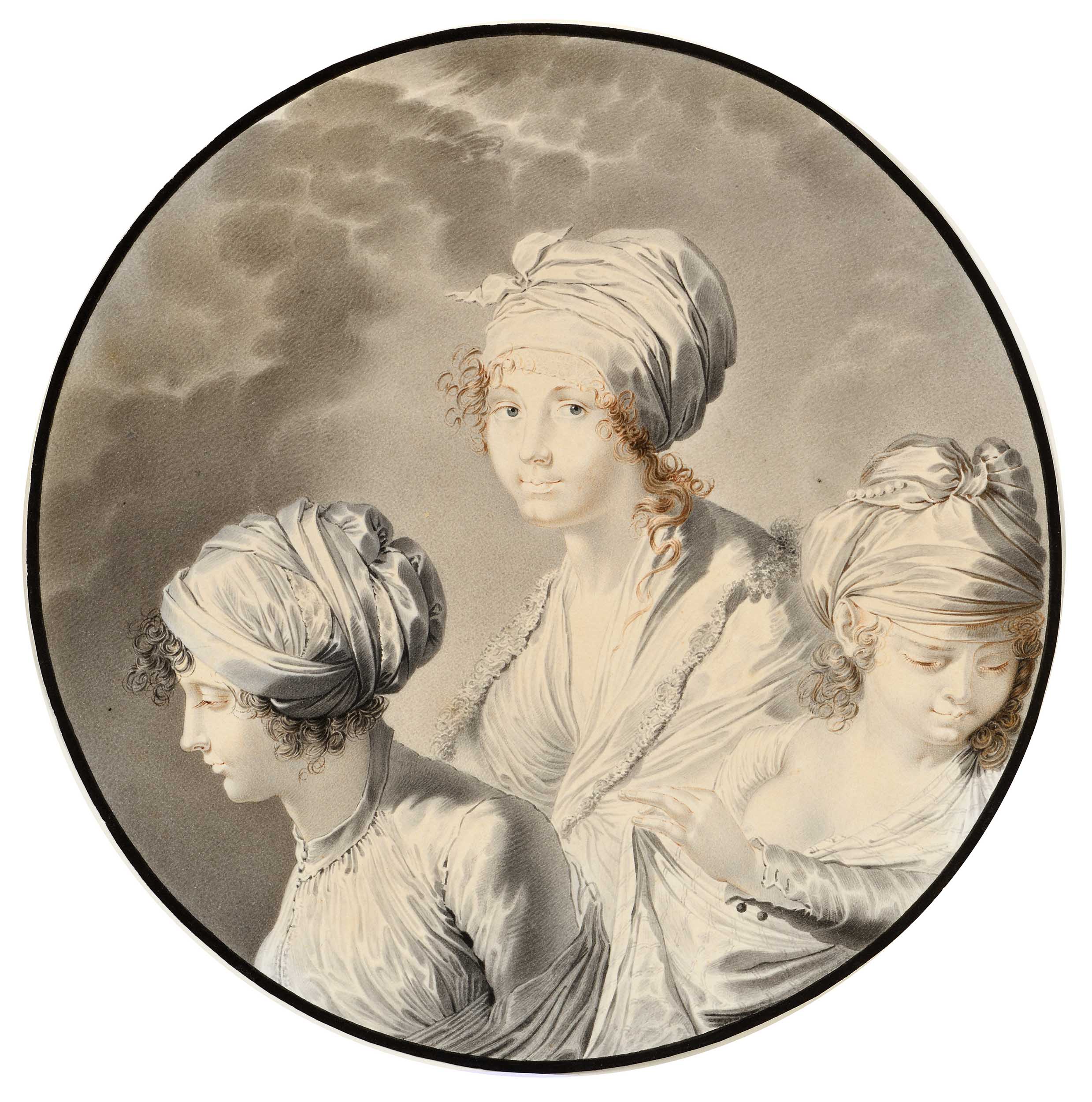 Comme l'a noté l’érudite Mimi Cazort, « les traits caractéristiques des dessins de Mauro [sont] un raffinement élégant de la ligne, une précision des détails et certaines conceptions stylistiques pour le rendu des mains et des visages[1] ». La présente feuille pourrait être une étude pour une lithographie ou une gravure, mais il est plus probable qu’elle ait été dessinée en tant qu’œuvre d’art indépendante destinée à être vendue à un collectionneur. Elle peut être rapprochée d’une poignée de dessins et d'aquarelles très élaborés, généralement exécutés sur papier vélin ou sur parchemin, produits par Mauro Gandolfi dans le premier quart du XIXe siècle pour une clientèle sophistiquée. Dans certaines de ces œuvres, l’artiste a adopté cette composition en tondo comme dans cette Fuite en Égypte (lavis d’encre de Chine, diamètre 225 mm, collection particulière). L’artiste a peint ici trois jeunes femmes, chacune coiffée d’un turban : l’absence de sujet bien défini donne une grande poésie à cette composition. Le fond de nuages est subtilement rendu par les dégradés du camaïeu de gris. Il faut noter l’extrême raffinement de la technique de l’artiste, uniquement constituée de petits traits d’encre de Chine ou brune apposées au pinceau fin. Cette composition semble avoir été appréciée car nous connaissons une autre version de notre dessin, aux dimensions proches mais avec quelques différences dans le fond nuageux et quelques ajouts à l’aquarelle, conservée au Fitzwilliam Museum de Cambridge [2].