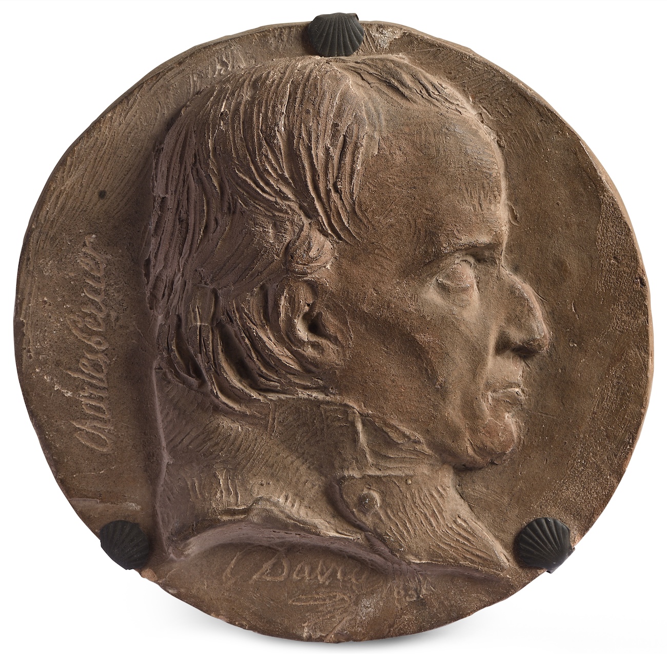 David d’Angers entre à l’Académie des Beaux-Arts en 1826. Dans la section sculpture. Il y retrouve, entre autres, Charles Percier (1764-1838), incontestablement un des plus importants architectes du début du XIXe siècle en France, entré à l’Institut en 1811. Les deux artistes entretiendront des relations étroites et nous connaissons plusieurs portraits dessinés de Percier par David d’Angers, tous réalisés lors des séances de l’Institut (L’Isle-Adam, musée Louis Senlecq, inv. SD0120)[1]. C’est à partir de ces études que David d’Angers va réaliser en 1835 une cire puis un plâtre original qui donnera lieu à l’édition d’un médaillon en bronze dont on connait plusieurs versions (Paris, musée du Louvre, inv. DA 53E)[2]. Notre médaillon, daté de la même année 1835, est une œuvre différente. On remarque de légères différences entre le médaillon en bronze et notre terre-cuite, notamment au niveau de l’arrangement des cheveux. Notre terre-cuite est donc une œuvre originale, différente des études ayant conduit à la réalisation du bronze. Elle fait partie des rares médaillons en terre-cuite, un matériau peu utilisé par David d’Angers et constituait probablement un cadeau, peut-être pour le modèle. Comme toujours chez l’artiste, celui fait du visage en profil une composition dont chaque détail prétend traduire le caractère, l’âme et la vérité du sujet. Ici, Percier, le cheveu en bataille, le col bien boutonné, le regard perdu vers la droite dans une contemplation intérieure. Comme la plupart des portraits en médaille de David d’Angers, on trouve ici un mélange de références à l’antique et d’exaltation romantique qui constitue pour l’artiste sa manière de représenter le Grand homme.