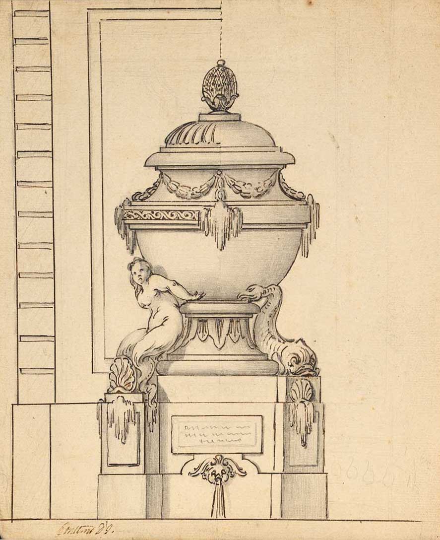 Excellent dessinateur, Contant d’Ivry laisse une abondante production graphique : plans, élévations, vases, autels, cheminées, mobiliers et ornements d’intérieur, où se lit son attachement à une architecture décorative pensée comme art total. Ses dessins, précis et équilibrés, reflètent un goût sûr et une maîtrise du tracé héritée de la tradition académique. Ce dessin représente un projet de vase monumental probablement destiné à orner un jardin, une fontaine ou un espace d’architecture intérieure, dans l’esprit des modèles diffusés par les recueils d’ornements du XVIIIáµ siècle. Le vase, couvert et surmonté d’un fruit de pin sculpté, repose sur un piédestal à degrés. Le corps est orné d’un riche décor à reliefs : guirlandes, enroulements et cartouches. Deux figures aquatiques — un triton et une naïade aux formes souples — s’appuient sur la panse, semblant animer la composition. Le socle, encadré de consoles et de coquilles stylisées, porte une plaque simulant une inscription, tandis que des masques et des chutes d’eau stylisées suggèrent un usage de fontaine. Le dessin, tracé à la plume et à l’encre brune avec des rehauts de lavis gris, allie précision géométrique et sens plastique. La rigueur du contour, la mise en page claire et l’équilibre des masses trahissent l’œil d’un architecte formé à la tradition classique, tandis que la présence de figures mythologiques et d’ornements fluides rattache encore le projet à l’esthétique rocaille.